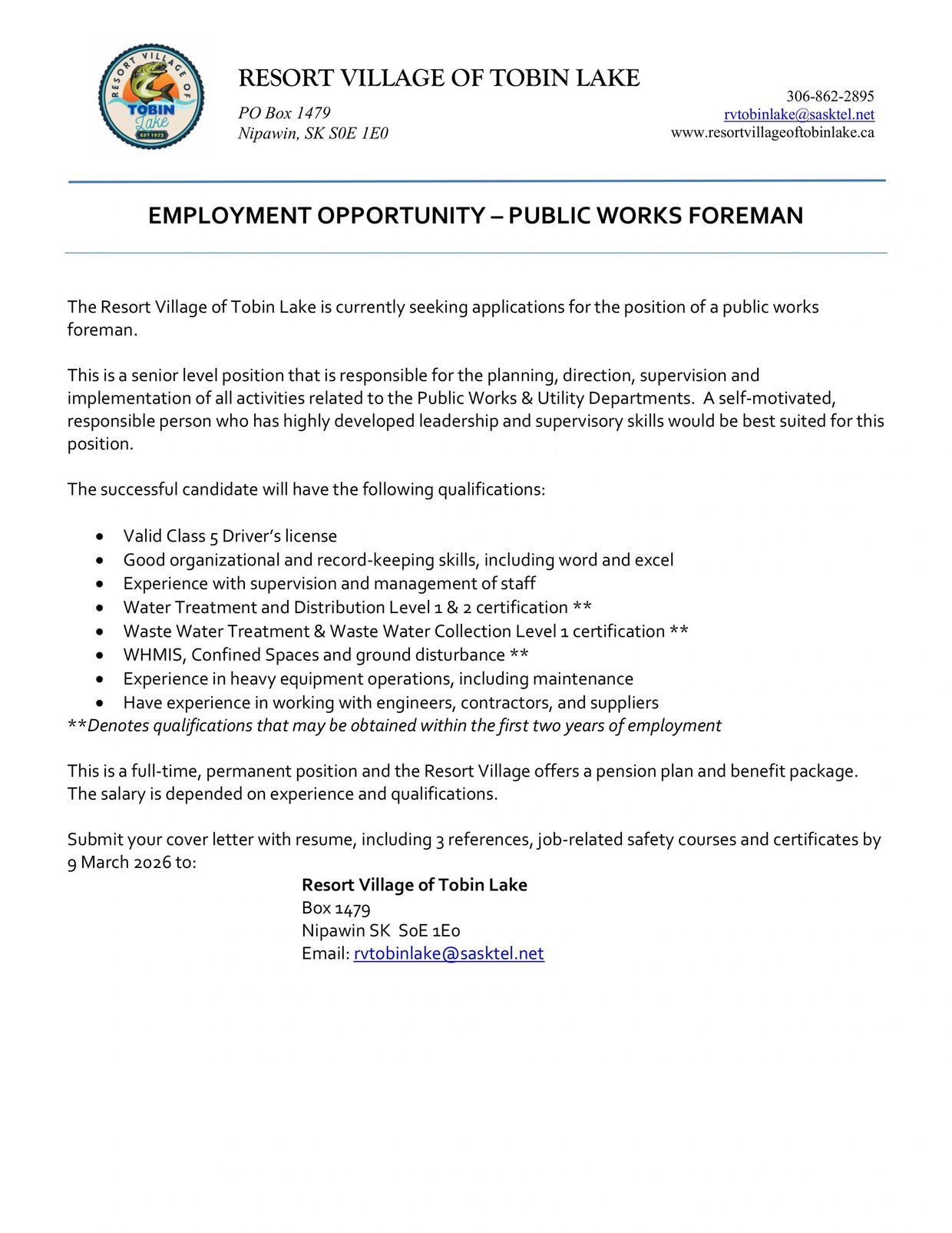 EMPLOYMENT OPPORTUNITY - PUBLIC WORKS FOREMAN